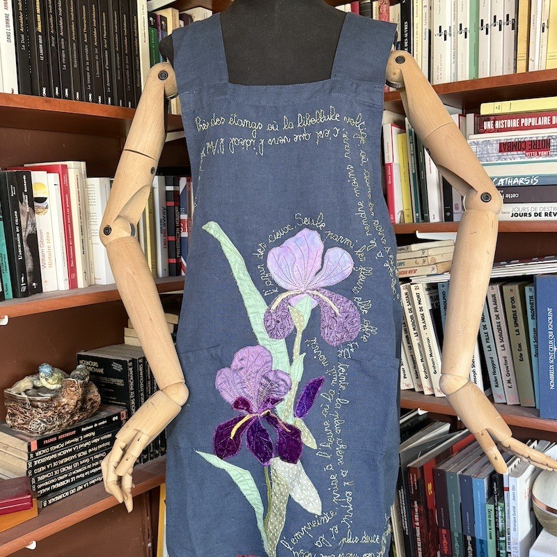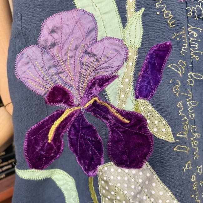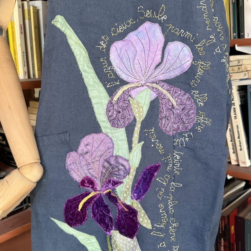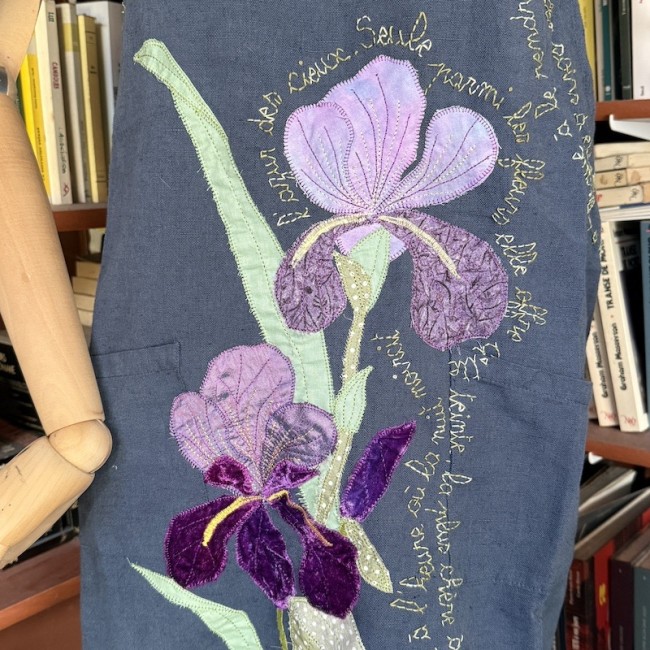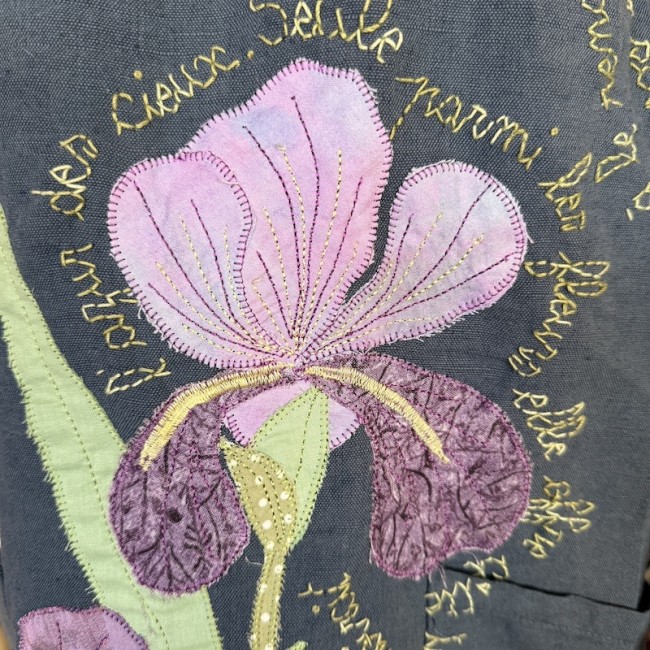 Appliqué machine des deux iris , broderie main du texte d'un poème de Charles Rouvin : l'Iris