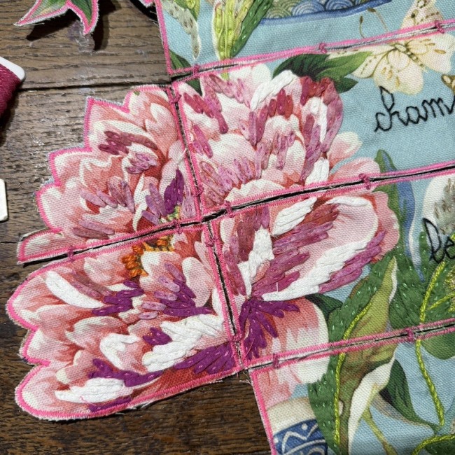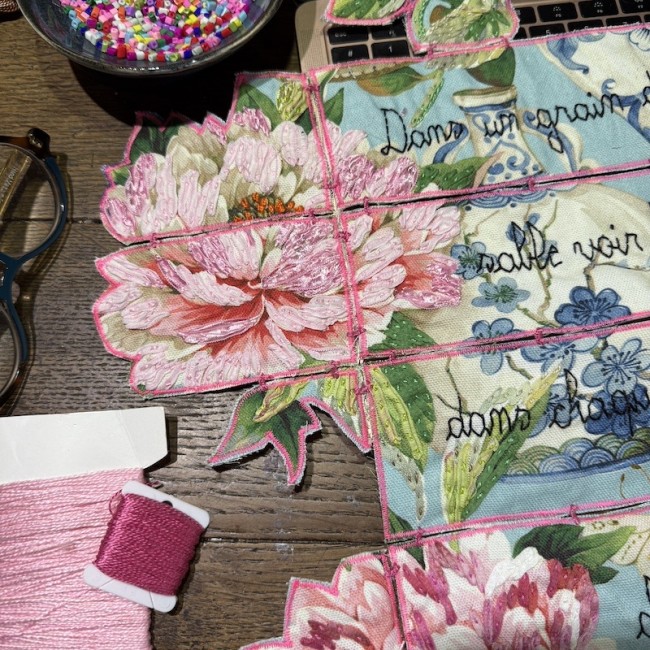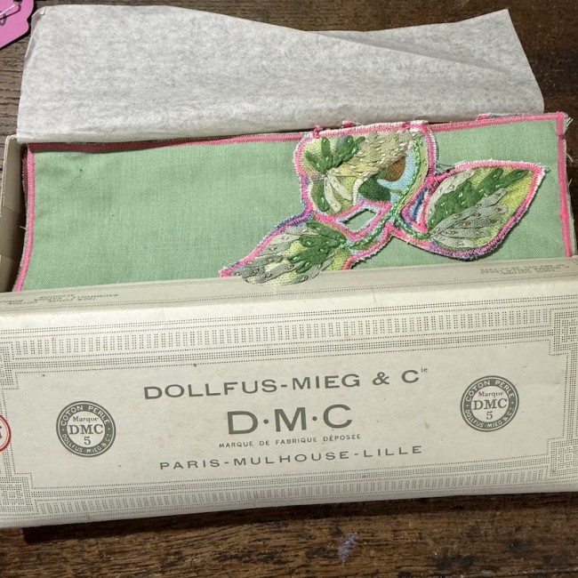 Boite à fils ancienne DMC emplie d'un texte poétique brodé