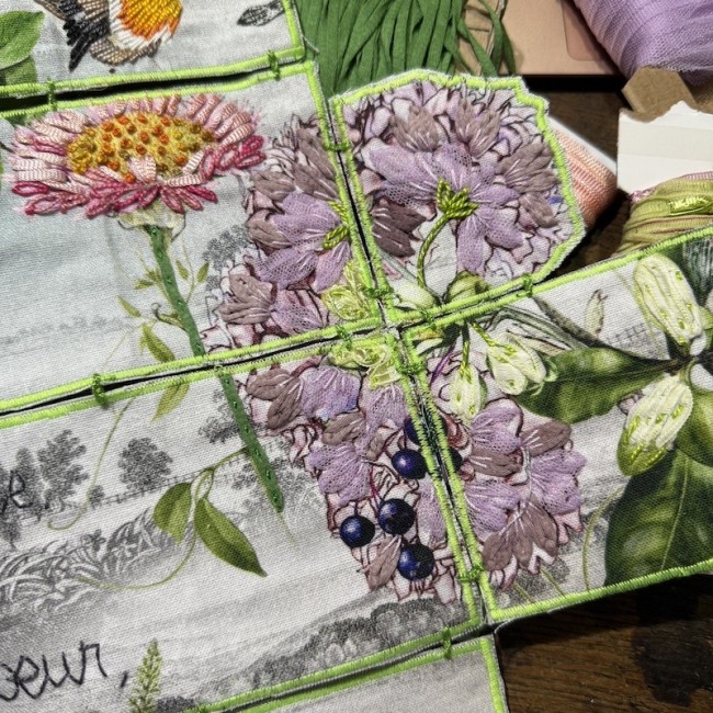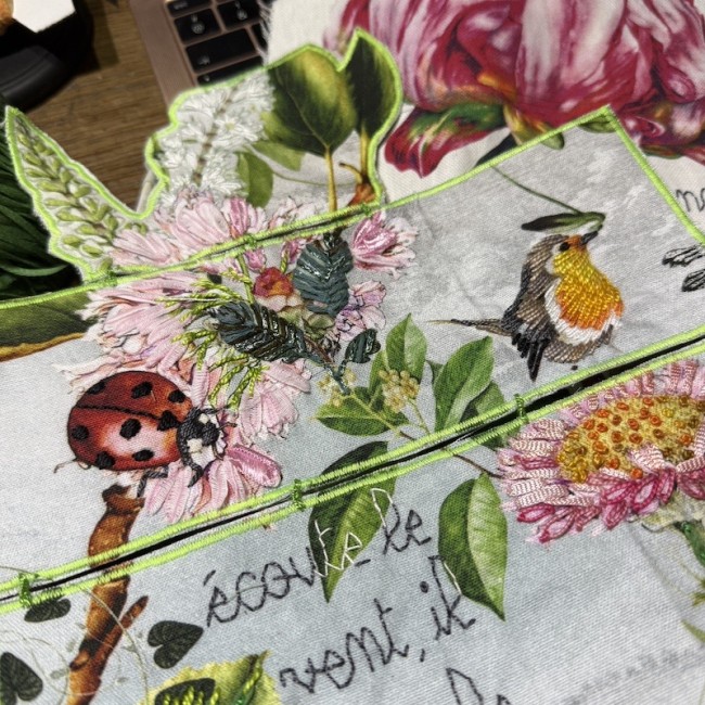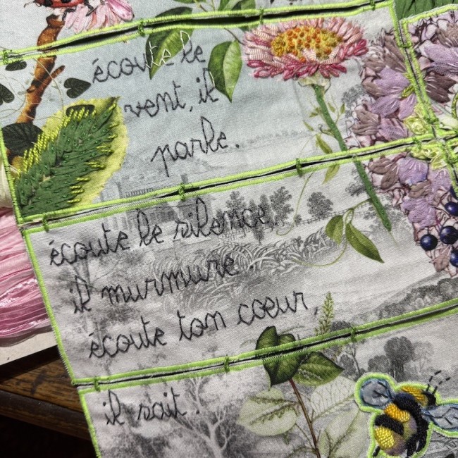 broderie main des éléments végétaux , des bestioles et du texte