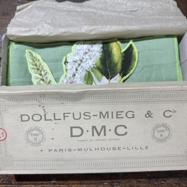 boite à fils ancienne DMC , emplie d'un texte poétique brodé replié dedans